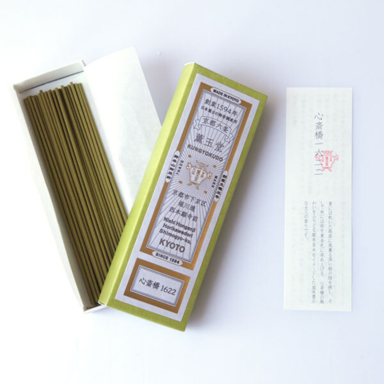 京都の香老舗 薫玉堂のお線香「心斎橋1622」。天然香料を用いた伝統の香りが、日常にやさしく溶け込みます。